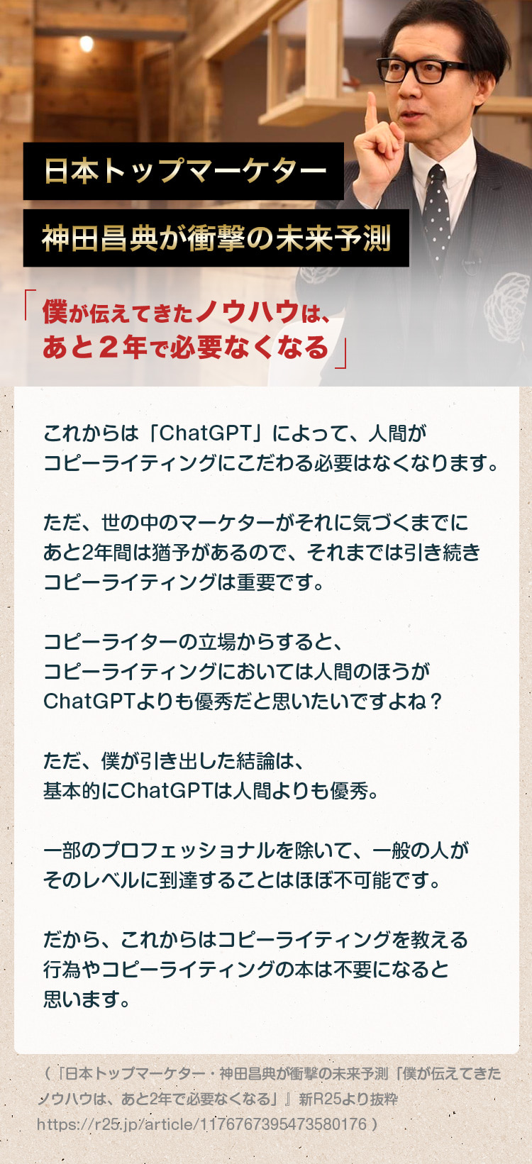 しかし、今読んで頂いた日本トップマーケター神田昌典さんが言うように、これからはAIの時代となります。