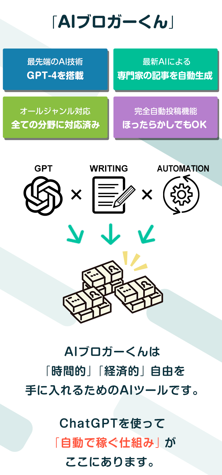 AIブロガーくんは、最先端AI技術GPT-4を駆使して読ませたいターゲットを簡単に選定でき、『専門家が魂を込めて書いたような読まれる魅力的な記事の自動生成』と『面倒なブログへの投稿』 をワンストップで全自動でおこなうオールジャンルに対応済みの『稼ぐ』に特化したAIライティングツールです。