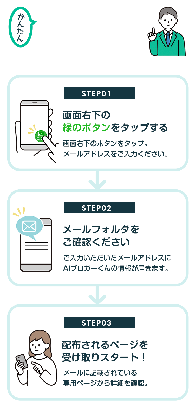 よくありがちな、どこで何をすればいいのかがわからない…というような難しい作りではなく、AIブロガーくんを初めて見た方でもわかりやすい、シンプルな設計にしています。